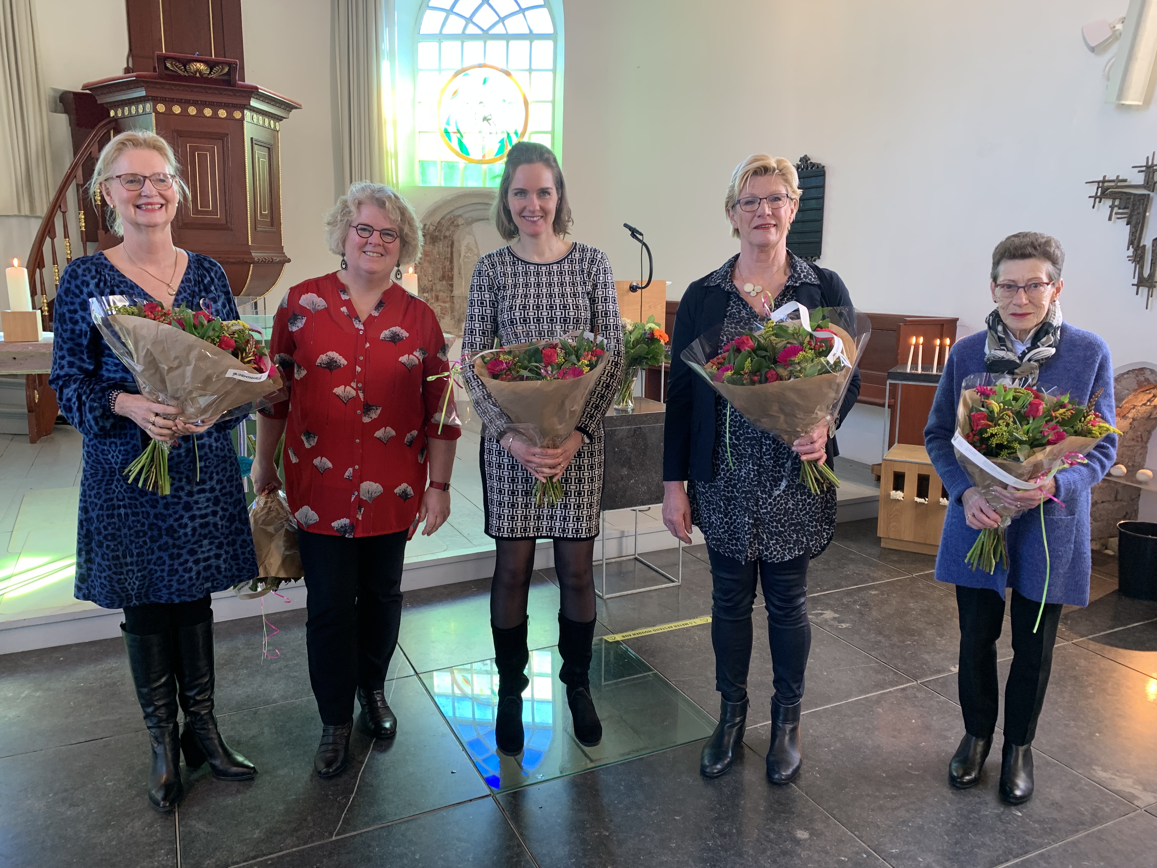 ![]() In de dienst van zondag 27 februari is er afscheid genomen van vijf kerkenraadsleden. Op de foto van links naar rechts: Ettie Hartholt, Annette Brandenburg, Engelien van der Zwaag, Jenny Mink en Jannie Willemsen. De voorzitter, Marian Krol, heeft hen persoonlijk bedankt voor hun inzet en sprak de hoop uit dat zij het goed zullen hebben te midden van onze gemeente. | ||