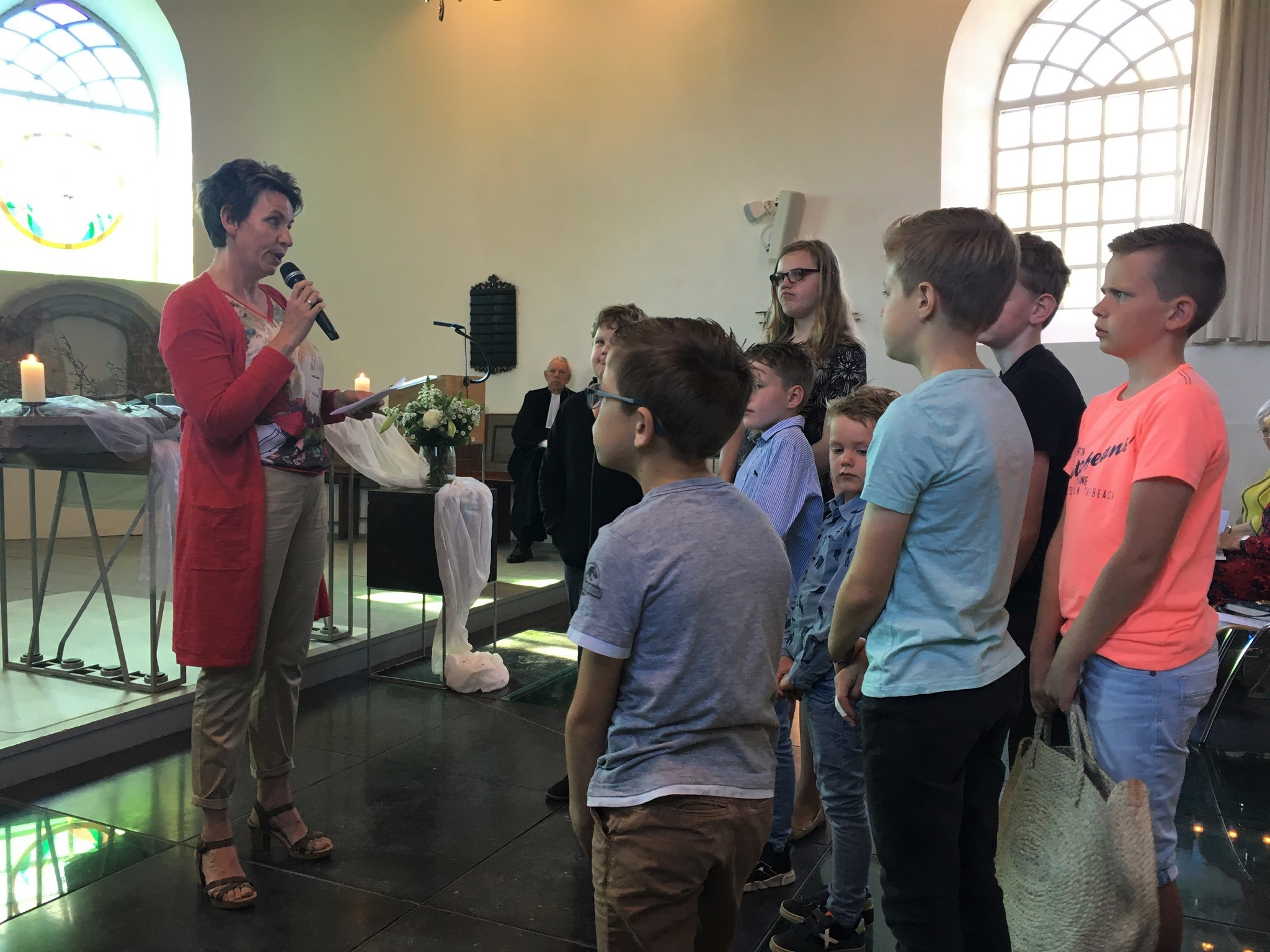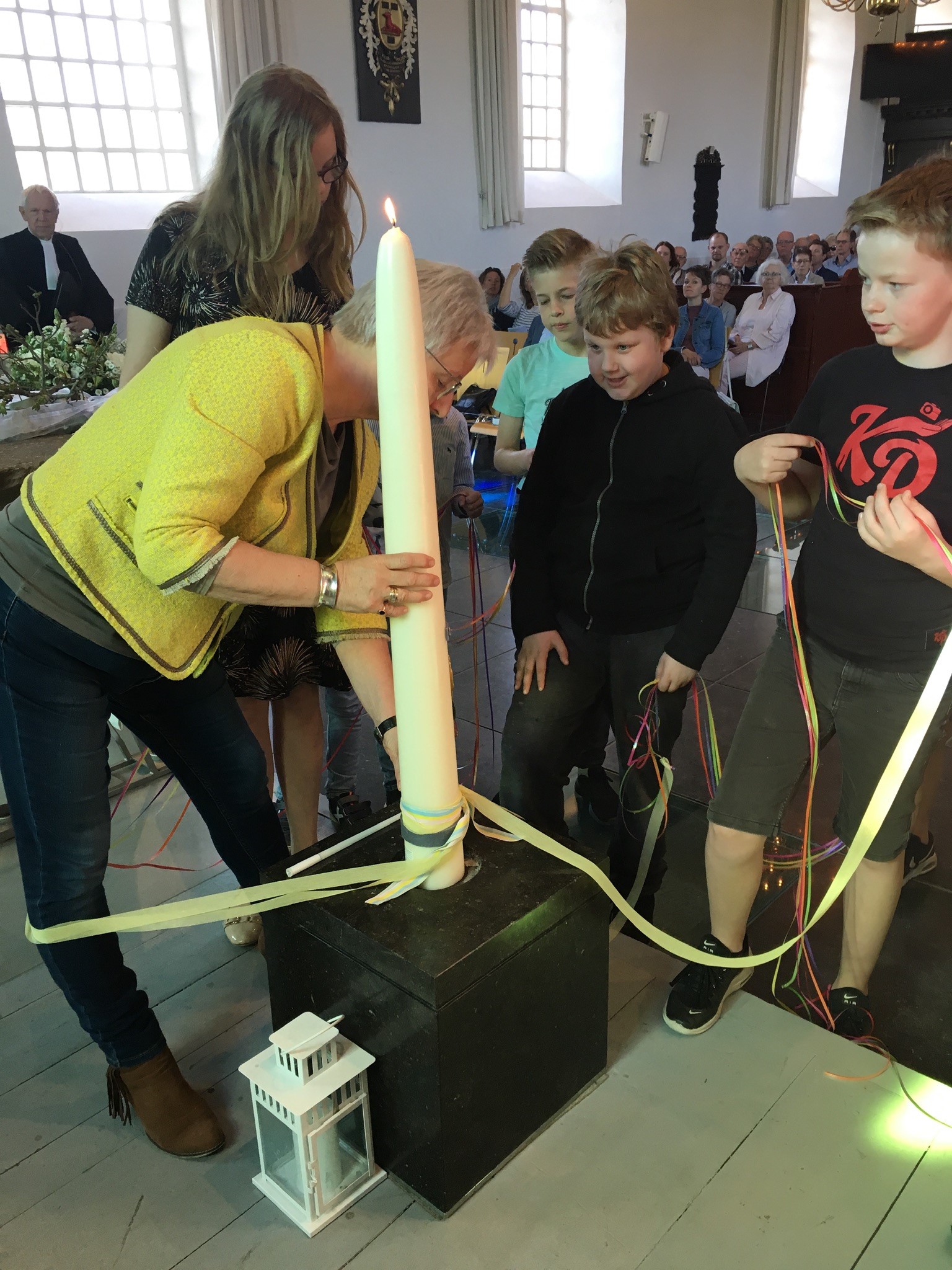 ![]() De nieuwe Paaskaars werd door diaken Marian Krol en de kinderen van de nevendienst binnengebracht en op zijn plaats gezet. ![]() Sieta de Vries heeft in een gesprek met de kinderen het 40-dagenproject afgerond. | ||