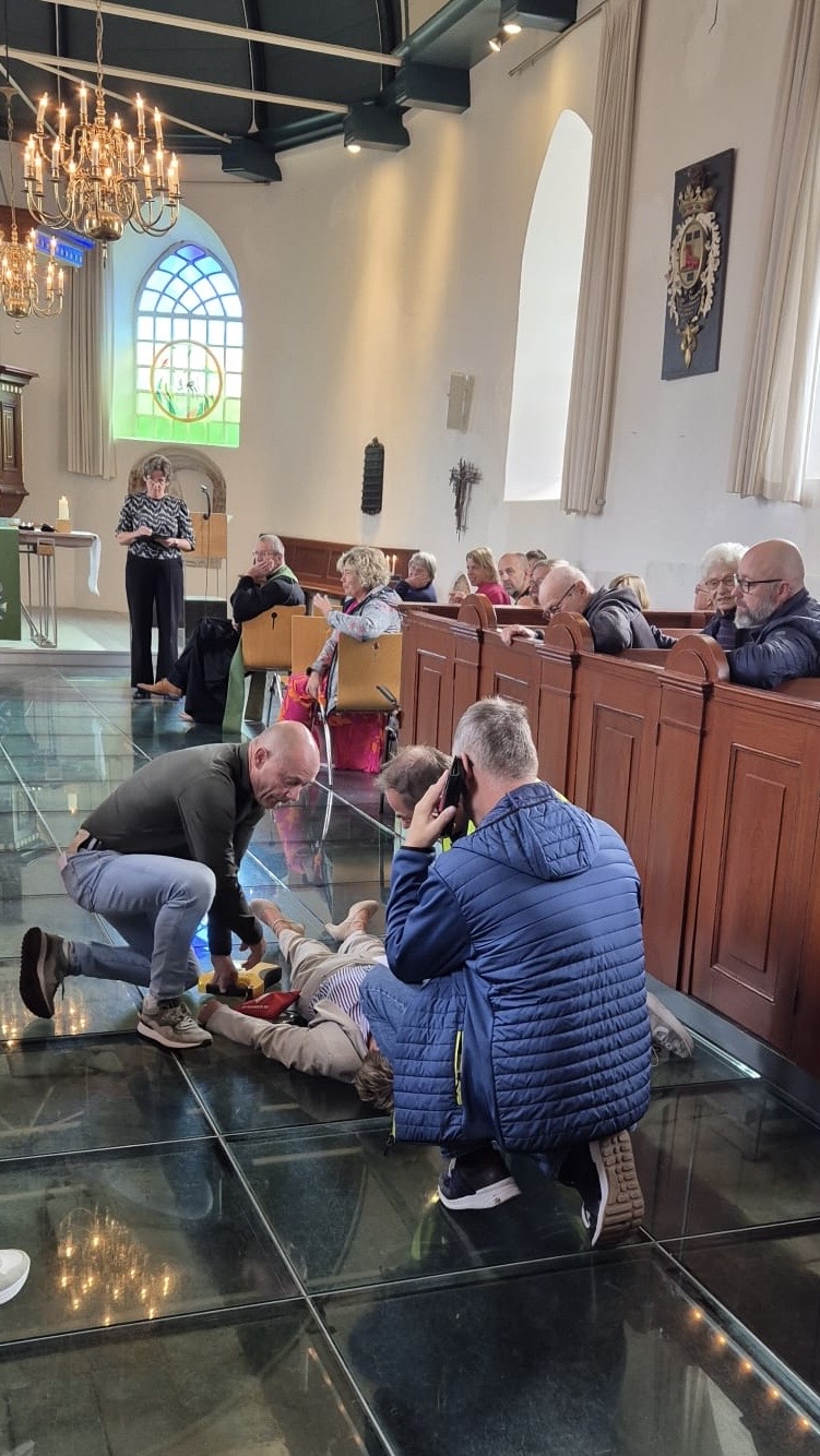 ![]() Bij deze hulpverlening hoort ook eventueel de ontruiming van het kerkgebouw. Dat hebben we geoefend op zondagmorgen 28 september na de dienst. In ongeveer 4 minuten was de kerkzaal ontruimd! | ||