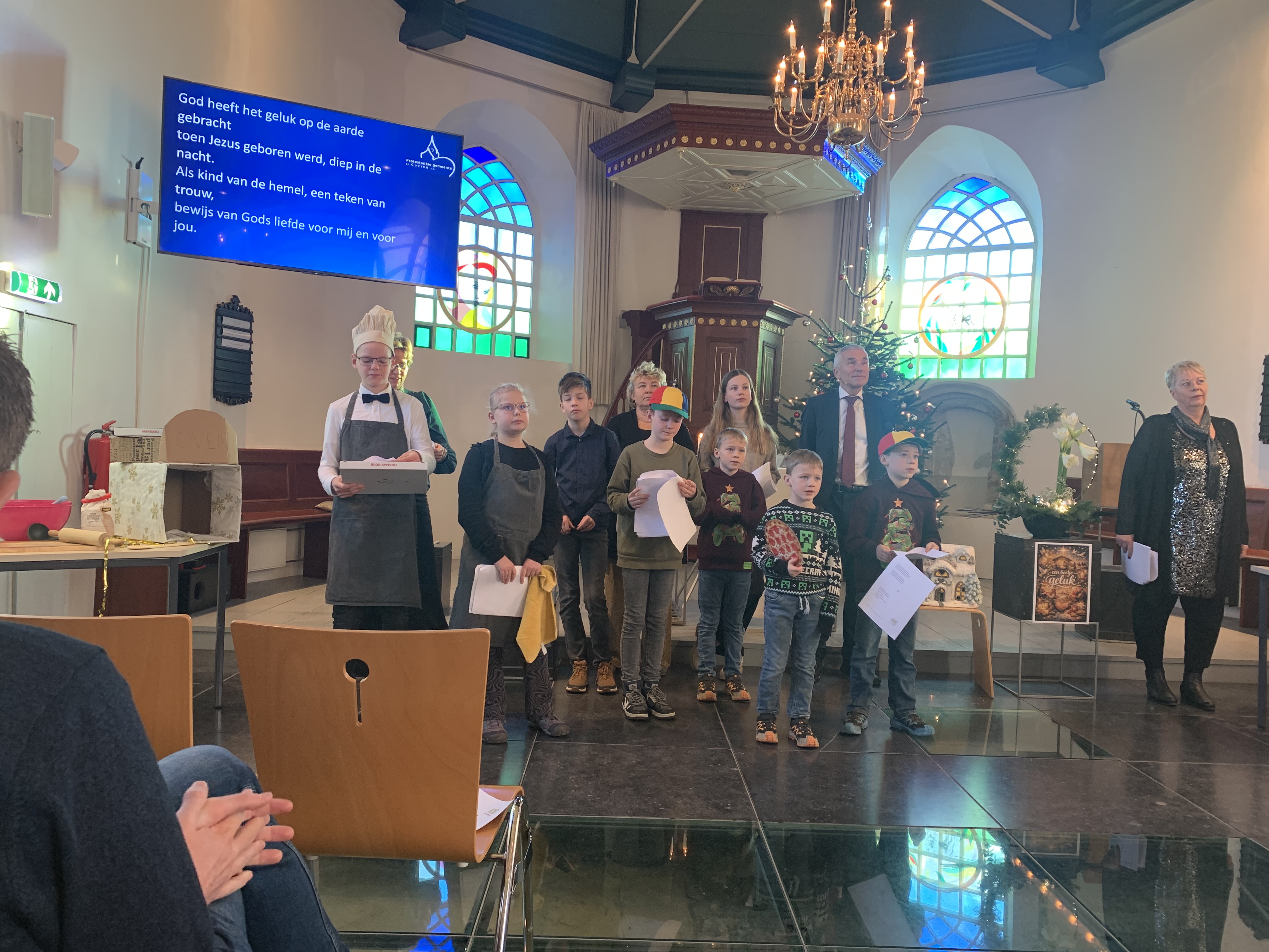 Het was vanmorgen een feestelijke kerstdienst o.l.v. ds. Siebe Sijtsema, waarin de kinderen een grote rol vervulden door voor ons de vrolijke musical 'De koekenbakkers van Caprese' met veel muziek en humor naar voren te brengen.