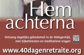 Hem achterna, op weg naar Pasen.Hem achterna is de titel van de digitale 40-dagenretraite. De retraite gaat op Aswoensdag 02 maart van start en eindigt op Paaszondag. Het is de zestiende digitale retraite van de jezuïeten. Op de vraag van de zoekende mens, geeft Jezus een ontwapenend antwoord: ‘Kom maar mee, dan zul je het zien.’ Die uitnodiging klinkt ook voor ons vandaag: Kom maar mee, leer Me (beter) kennen, zie waar Ik me ophoud, ontdek waar Ik je tegemoet kom in jouw leven, in deze wereld, in deze tijd. Deelnemen aan de retraite is ingaan op die uitnodiging. Hoe deelnemen? Je kunt je voor deze gratis digitale retraite inschrijven via www.40dagenretraite.org. Deelnemers van de digitale retraite krijgen dagelijks een gebedsmail met Bijbelteksten, meditatieve vragen, citaten en gebedstips. Het geheel vormt een innerlijke reis om de 40-dagentijd, de Goede Week en het Paasmysterie intenser te beleven. Op zaterdagochtend tijdens de 40-dagentijd kunnen deelnemers van de retraite meedoen aan een geleide meditatie via ZOOM. Enkele citaten van deelnemers aan de vorige digitale retraite: